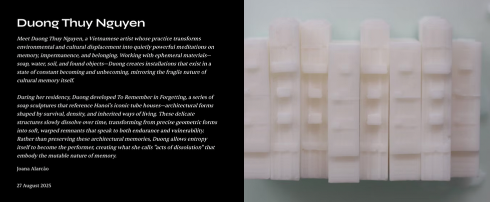 This body of work takes the architectural form of the Hanoi tube house—those narrow, stacked structures shaped by necessity and the compressed tempo of urban life. Recast in soap, a material chosen for its ephemerality and sensuous tactility, each sculpture functions as both monument and memento.